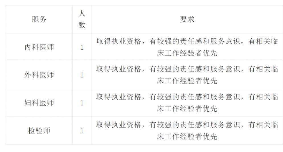 2. 招聘要求: (1)临床医生:本科及以上学历,具有执业医师资格,有临床工作经验者优先。 (2)护士:大专及以上学历,具有护士执业资格,有护理工作经验者优先。 (3)药剂师:大专及以上学历,具有药剂师资格,有药剂工作经验者优先。 (4)检验师:大专及以上学历,具有检验师资格,有检验工作经验者优先。 (5)公共卫生医师:本科及以上学历,具有公共卫生医师资格,有公共卫生工作经验者优先。