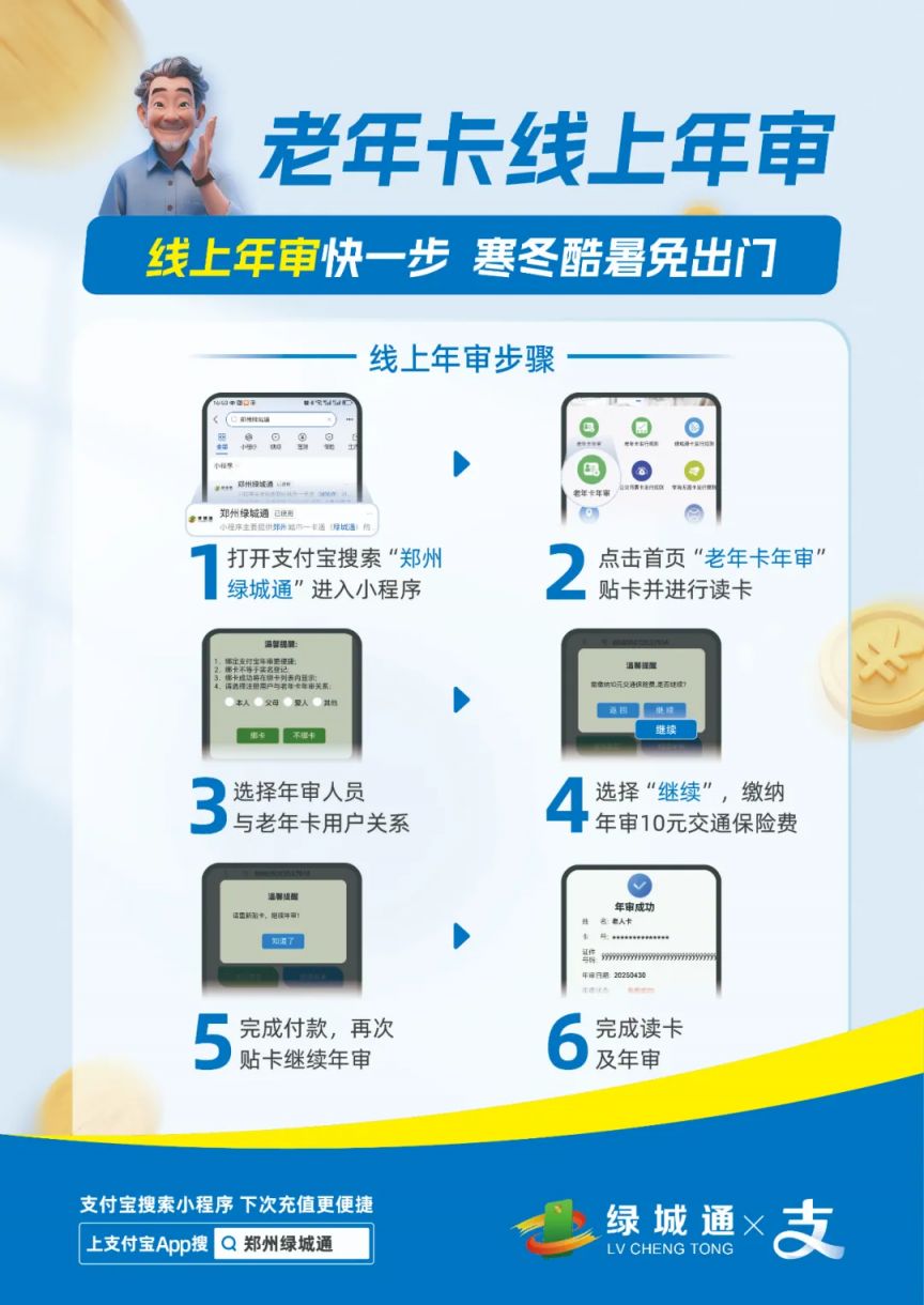 上支付宝小程序搜“郑州绿城通”,点击老年卡年审,进行年审办理,每天前10000名绑卡年审用户,可获得年审优惠券(前1000名绑卡年审用户,可获得5元优惠券。其余9000名绑卡年审用户,可获得2元优惠券);活动每天更新,持续至4月30号,先到先得。