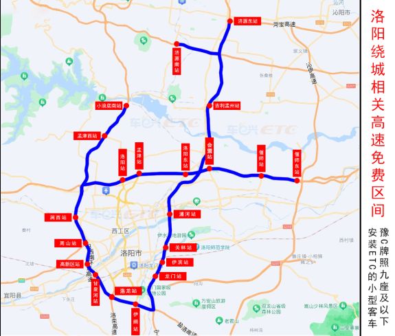 免费站点:洛阳站、孟津站、洛阳东站、瀍河站、关林站、伊滨站、龙门站、伊阙站、洛龙站、甘泉河站、高新区站、周山站、涧西站、吉利孟州(孟州吉利)站、会盟站、偃师站、孟津西站、济源东站、济源南站、小浪底南站、偃师东站共21个收费站。