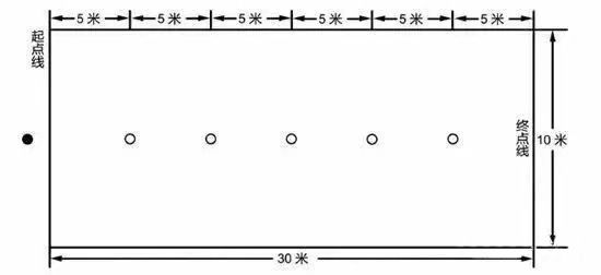 在平整的场地上进行,测试区域长30米,宽10米(如图)。起点距离第一个标志杆5米,起点必须和标志杆对齐。场地内共5个标志杆,各杆相距5米,标志杆距离边界5米,高度不低于1.5米。起终点设置有电子发令和计时设备。
