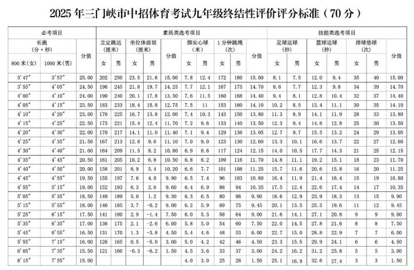 1、九年级终结性评价合计70分。其中,长跑分值为25分;考生从素质类选考项目中选考2项,从技能类项目中选考1项,每项分值为15分。