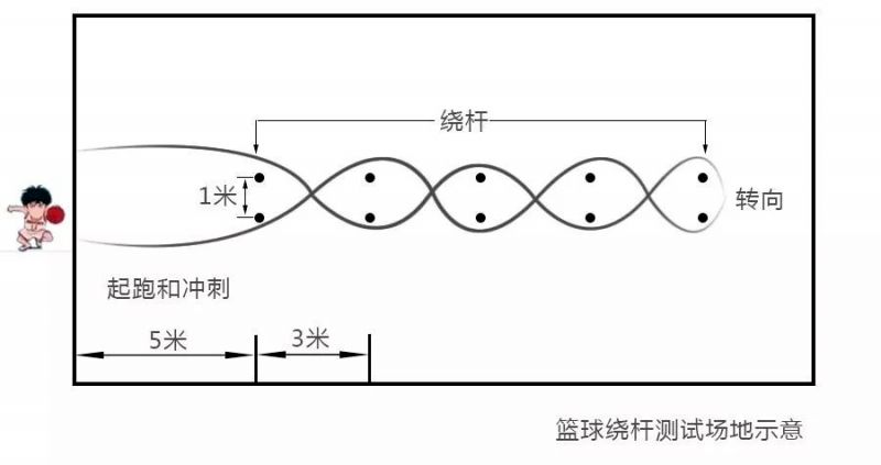 场地长20米,宽7米。起点线前5米处开始设置标志杆,共设5排,每排2根各排标志杆之间相距3米,同排的两根标志杆底座中心点之间相距1米,距同侧边线3米。