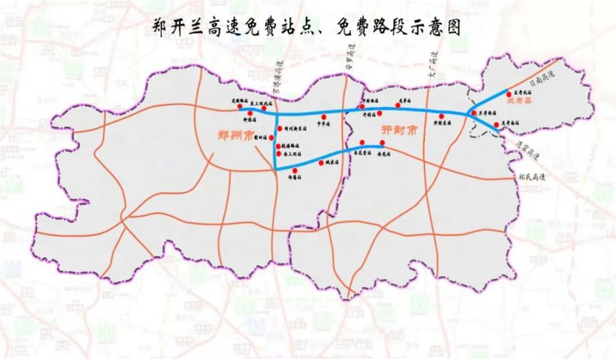 对郑州籍、开封籍牌照ETC小型客车(9座以下,含9座),通行郑开兰间连霍、郑民、京港澳和日兰高速指定路段共194公里,且在花园路站、柳林站、东三环北站、中牟站、开封西站(新增)、开封站、龙亭站(新增)、开封东站、兰考站、郑州新区站、圃田站、航海路站、南三环站、郑庵站、姚家站、杏花营站、南苑站、兰考北站、兰考西站共计19个指定收费站点之间,上下站口产生的通行费,由郑州市、开封市、兰考县政府统缴、车主免费通行。