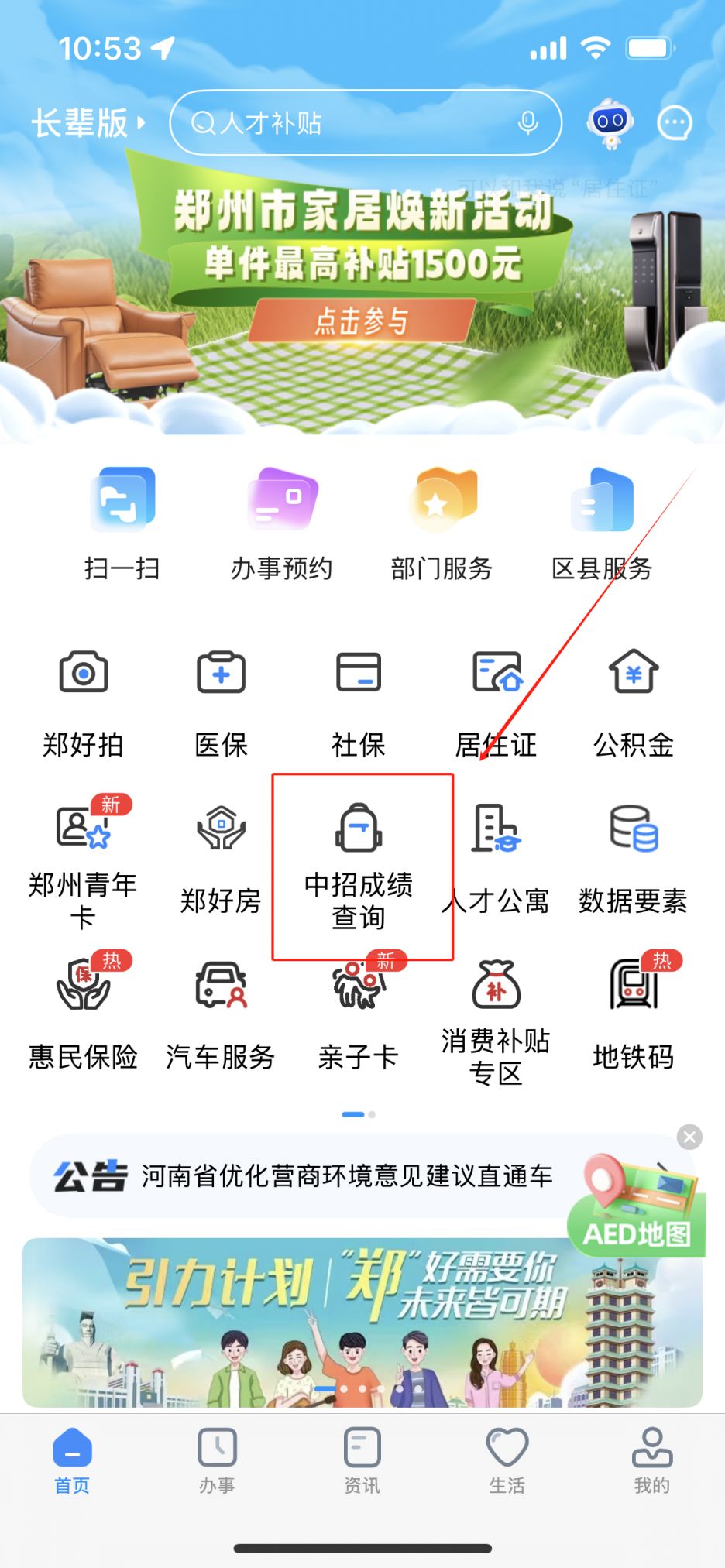 3. 手机下载“郑好办”APP,注册登录并进行实名登记后,在首页找到中考成绩查询,点击进入输入考生相应信息即可查询