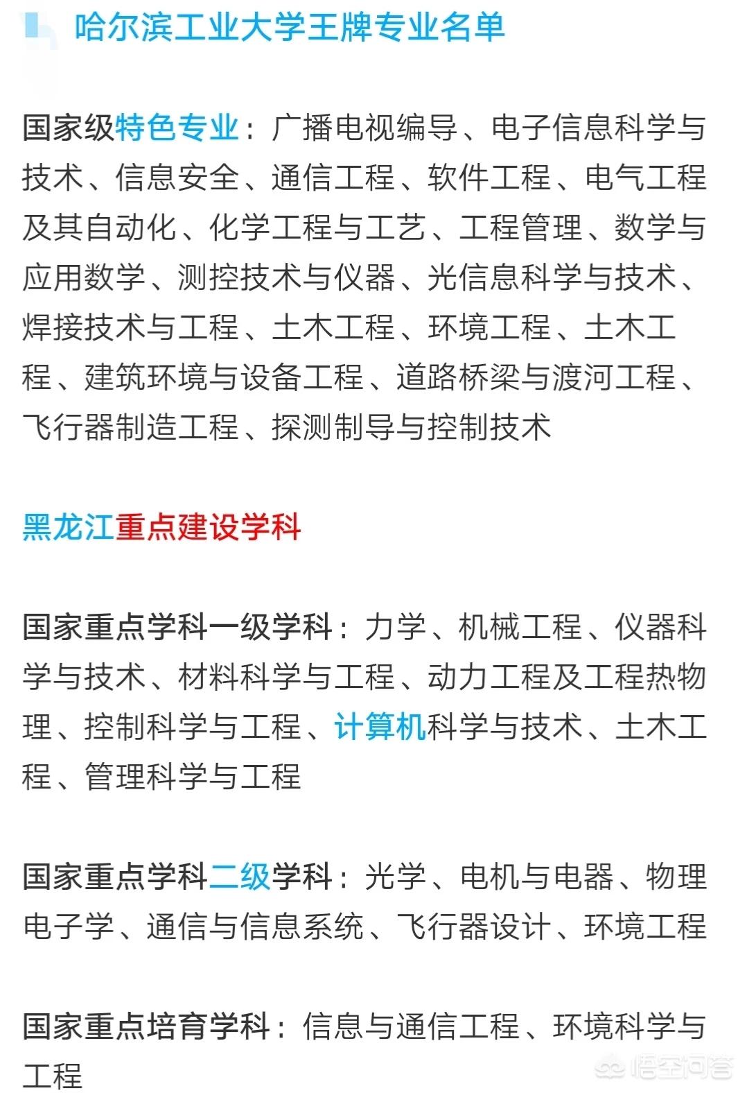 哈工大由哈尔滨工业大学和哈尔滨建筑大学河北组建,现在已经是一所以理工为主,理、工、管、文、经、法等多学科协调发展的国家重点大学,它的强势专业有很多,比如仪器科学、机械设计制造及其自动化专业、计算机科学与技术、焊接技术与工程、自动化、通信工程、电气工程及其自动化、土木工程、飞行器设计与工程、材料科学与工程、建筑学等。在第四轮学科评估中,哈工大有3个A+学科(环境科学与工程、机械工程、控制科学与工程),5个A学科(力学、材料科学与工程、计算机科学与技术、土木、管理科学与工程),9个A-学科(仪器科学与技术、动力工程及工程热物理、电气工程、光学工程、软件工程、城乡规划学、化学工程与技术、信息与通信工程、数学),其他等级不再赘述。