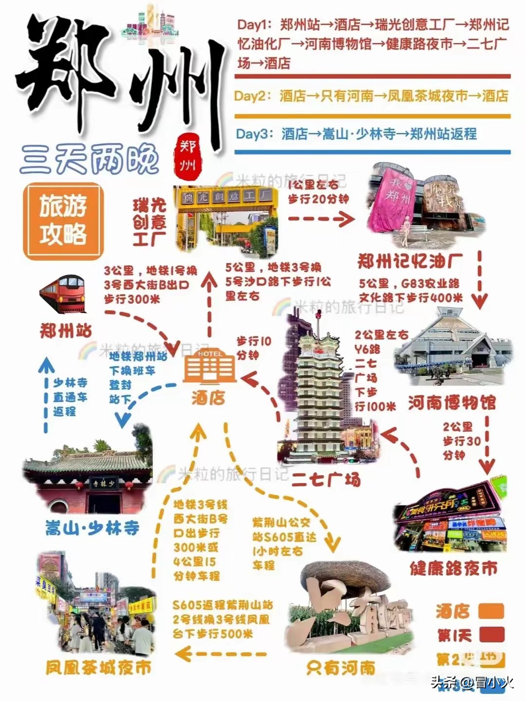 第一天主要去河南博物馆,作为全国仅次于故宫博物馆第二受欢迎的博物馆,里面各种奇珍异宝,值得去观赏学习,顺带着瑞光创意工厂,二七广场,健康路夜市可以打卡。第二天主要就是只有河南了,以黄河文明为根基,通过沉浸式戏剧展现河南历史文化,代表作包括《火车站剧场》《李家村剧场》等,都值得一看。第三天去一下少林寺,然后返程回家。